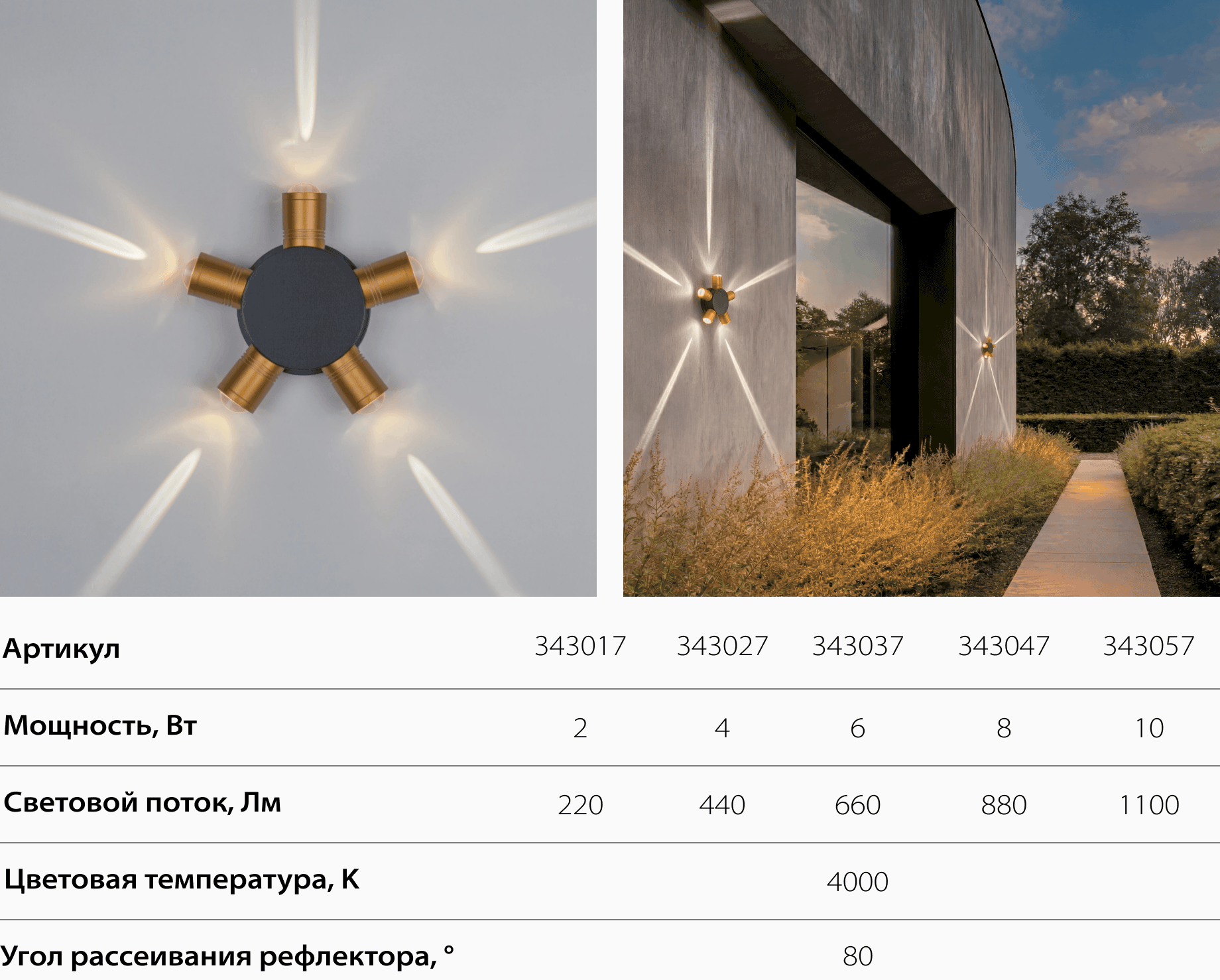 Минималистичный чёрный корпус с эффектным световым рисунком на стене. Надёжный и стойкий к погоде — идеален для фасадов, террас и загородных домов.