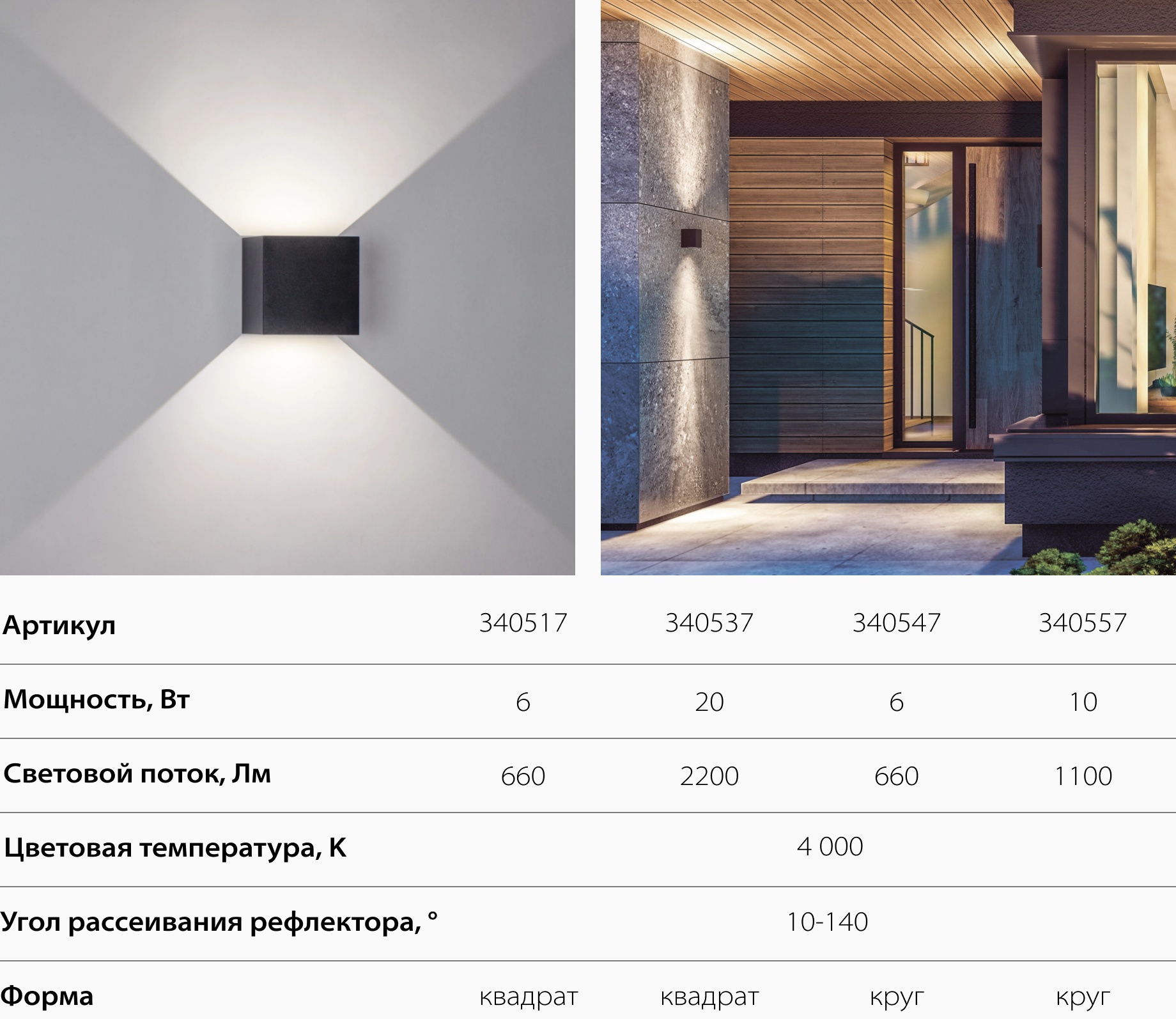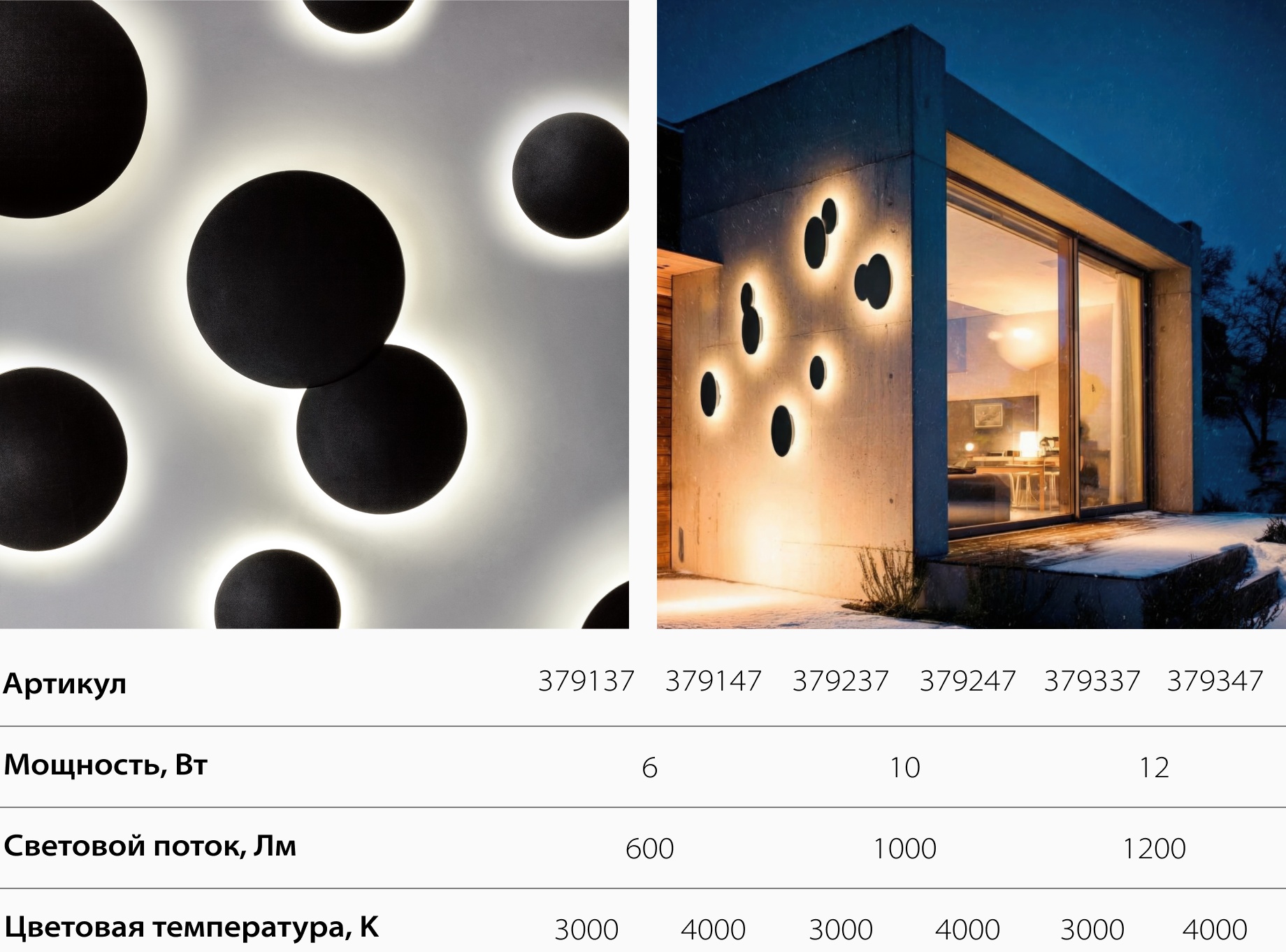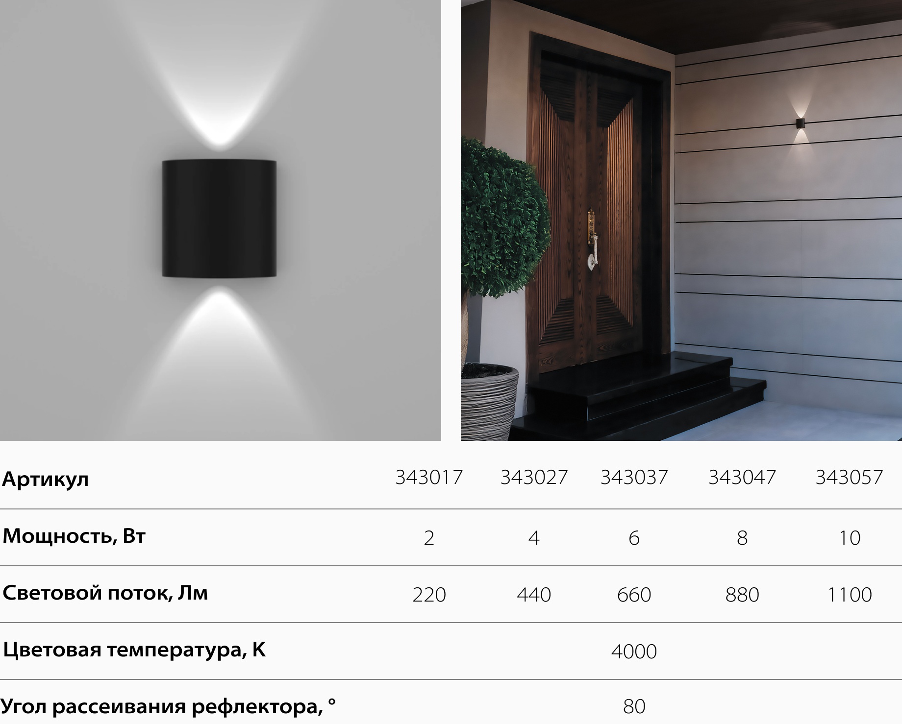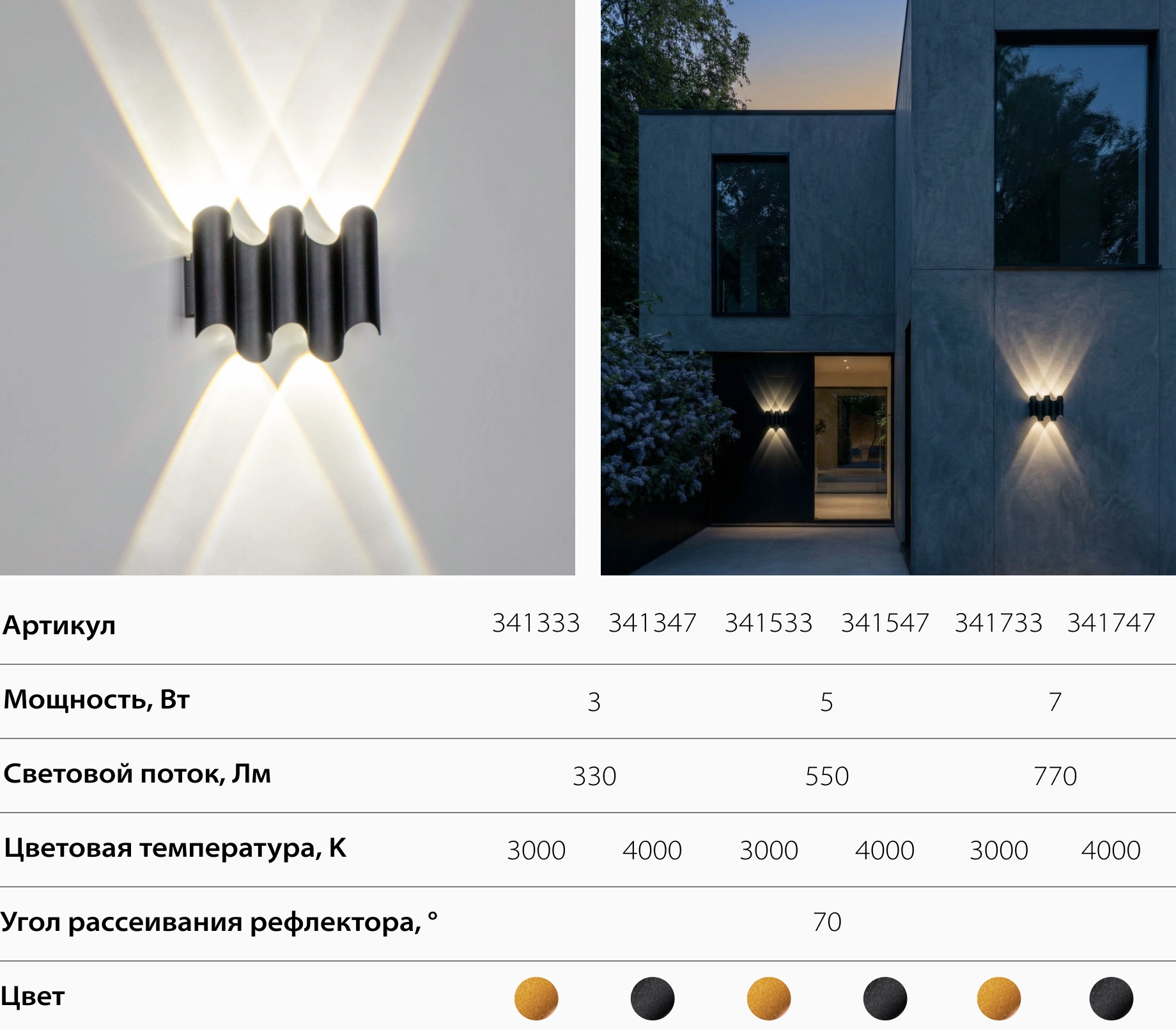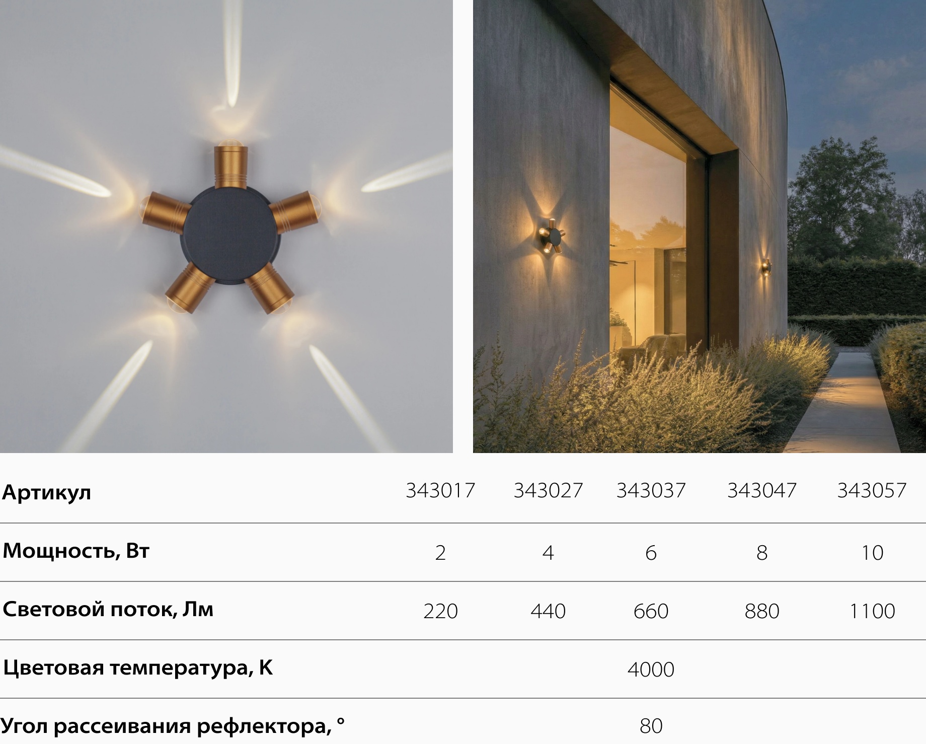 Минималистичный чёрный корпус с эффектным световым рисунком на стене. Надёжный и стойкий к погоде — идеален для фасадов, террас и загородных домов.